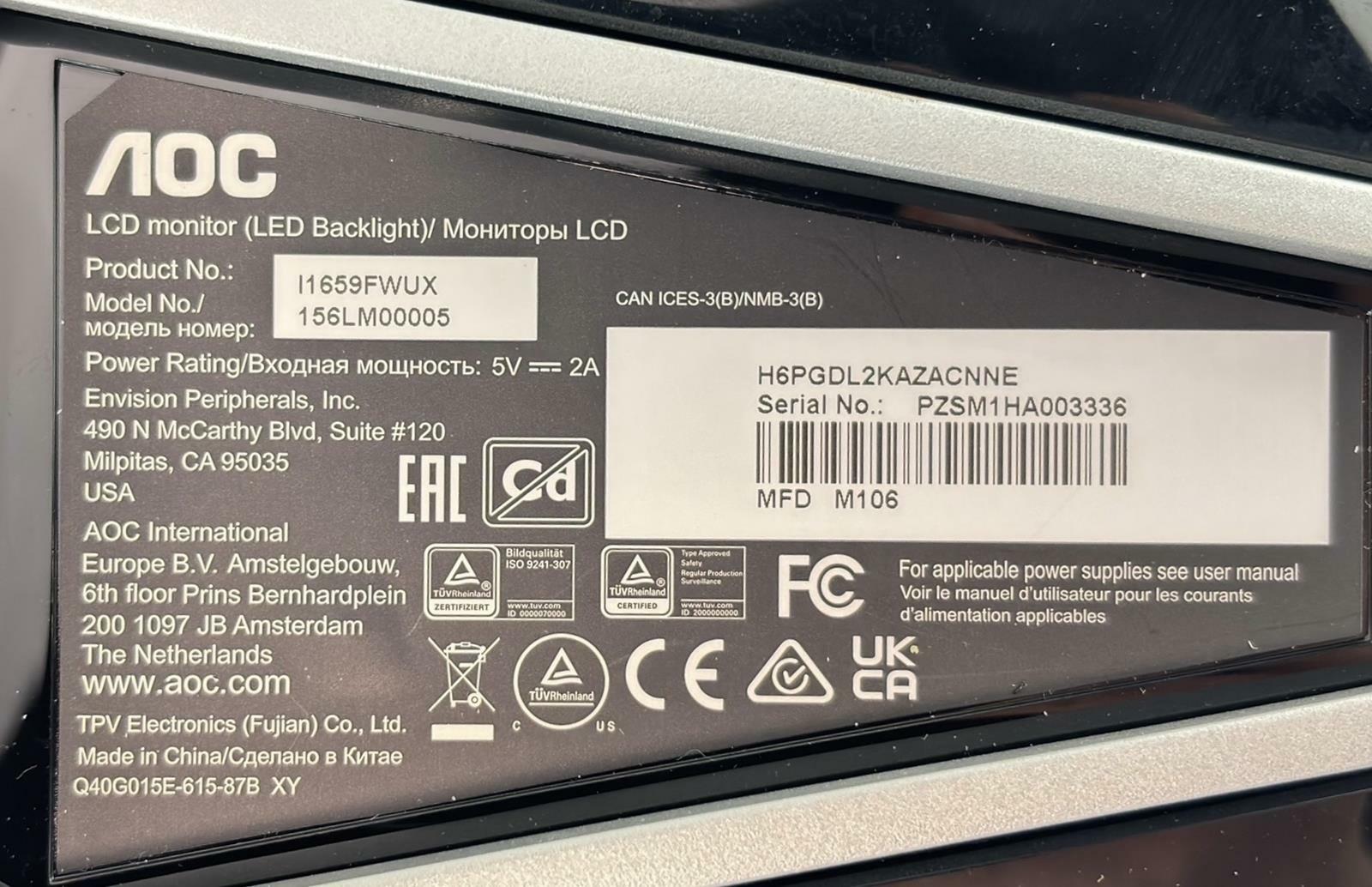 Included Items & Quantities:(1) AOC 156LM00005 (l1659FWUX) 15.6" Slim Portable Monitor