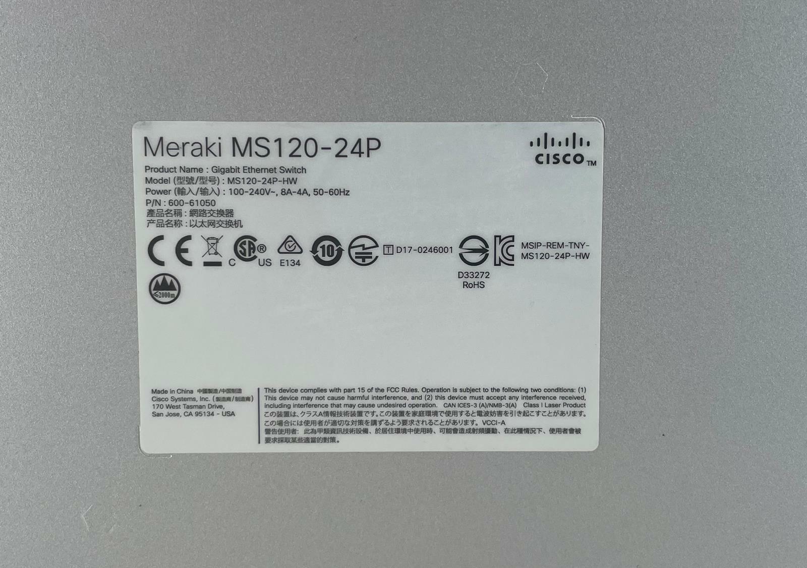 Included Items & Quantities:(1)Cisco Meraki MS120-24P Gigabit Ethernet PoE Network Switch