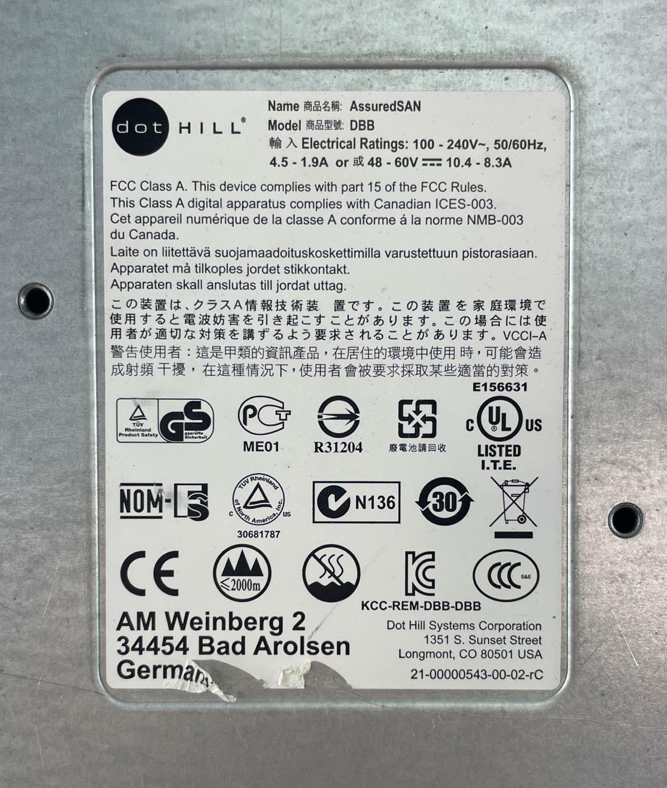 Included Items and Quantities:(1) Dot Hill DBB Assured SAN Expansion 12x Bays +Trays